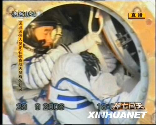 9月28日,神七返回艙艙門打開。航天員準備出艙。新華社發(電視截圖)