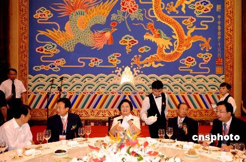 6月27日,全國政協(xié)副主席、臺盟中央主席林文漪在北京全聚德烤鴨店請臺灣臺中縣縣長黃仲生、彰化縣縣長卓伯源、南投縣農(nóng)業(yè)處處長陳朝旺等吃北京烤鴨。 中新社發(fā) 廖攀 攝