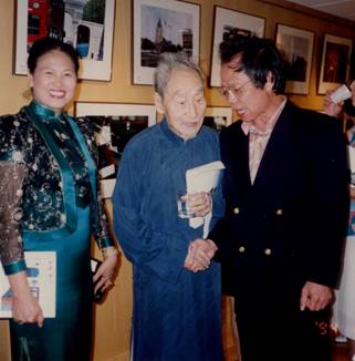 朗靜山大師(中間)與作者謝雨辰夫婦(合影于二哥影展現(xiàn)場)