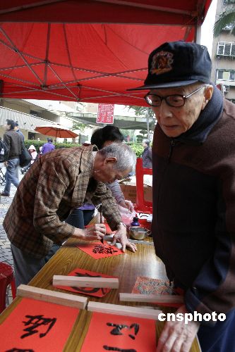 二00七臺北眷村文化節開幕,老人們在活動現場書寫對聯。 中新社發 陳國華 攝