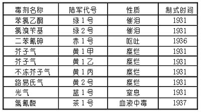 至1937年,日本陸軍將研究和改進的化學武器加以制式化,正式列為裝備軍隊的武器。這時,正式確定為日本陸軍使用的化學毒劑有:(見下表)