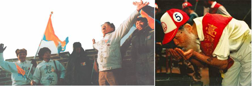 上世紀(jì)八十年代,臺灣民間涌起“老兵返鄉(xiāng)探親”運(yùn)動(dòng),老兵身掛“回家”標(biāo)語的照片。