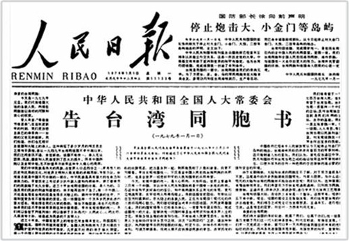 1979年元旦,全國人大常委會發表《告臺灣同胞書》,鄭重提出和平統一的方針,這是新時期中國共產黨和中國政府對臺方針政策的重要宣示,標志著對臺方針政策的重要轉變。