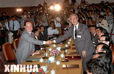 1993年4月27日,“汪辜會談”前汪道涵(左)與辜振甫握手
