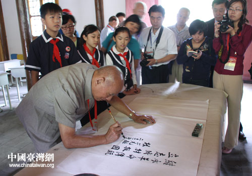 “繼承革命傳統(tǒng),立志成才報國——林上元題,二零一一年九月八日,年八十七歲”。黃埔同學(xué)會會長林上元先生為武昌實(shí)驗(yàn)小學(xué)題詞,希望小朋友們學(xué)習(xí)老一輩革命家的精神,立志成才,報效祖國。(中國臺灣網(wǎng) 李丹 攝)