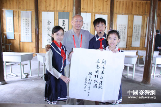 黃埔同學(xué)會會長林上元先生與武昌實(shí)驗(yàn)小學(xué)的小講解員代表合影。(中國臺灣網(wǎng) 李丹 攝)