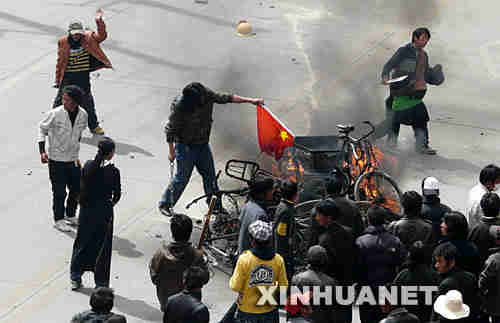 “3·14”拉薩暴力事件發生時,凡是門口懸掛哈達的商鋪都“幸免于難”,而其他一些在門口做了“大起義”英文縮寫“T·G·C”標記的店鋪則被洗劫一空,甚至付之一炬,“以純服裝店”5個花季少女更是葬身火海。暴徒們“聲東擊西”、“多點出擊”,在更大范圍內打砸搶燒,進行破壞。