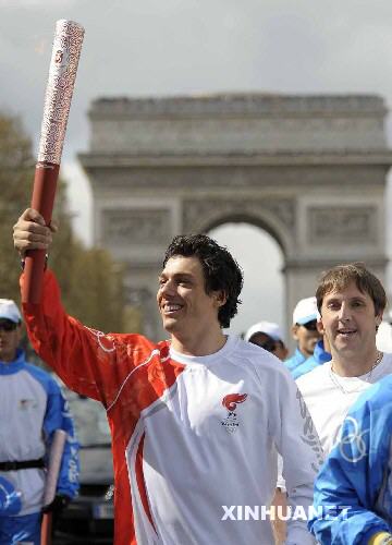 4月7日,奧運火炬手在巴黎凱旋門前進行傳遞。當日,北京奧運圣火傳遞活動在法國巴黎舉行。 新華社記者戚恒攝