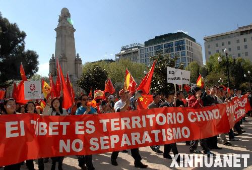 4月14日,西班牙上千名華人華僑和留學生在馬德里市中心的西班牙廣場舉行游行集會活動,反對西藏分裂,反對西方歪曲報道,維護統一,支持北京奧運。 新華社記者陳海通攝
