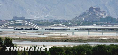 資料圖片:2006年7月1日11時20分許,由拉薩發出的“藏2”次慶典列車通過拉薩河特大橋。當日,青藏鐵路全線通車。 最新統計顯示:2007年西藏自治區生產總值超過342億元,人均GDP超過1.2萬元,按可比口徑計算均比2002年翻了近一番,西藏經濟實現了連續7年保持12%以上的增速跨越發展。西藏經濟的快速發展凝聚了中央政府的殷殷關切。從一批又一批大型基礎設施建設,到對農牧民醫療衛生保障、教育、文化保護等社會事業的大力支持,來自中央財政的資金援助和政策扶持為西藏經濟社會事業的發展注入活力。 新華社發