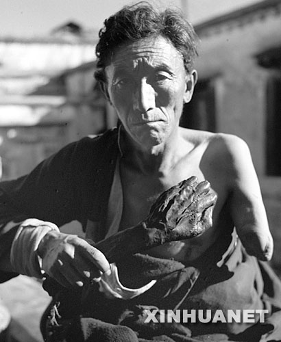 資料圖片:西藏日喀則專區奴隸出身的多扎瓦在控訴吃人的農奴制度。領主的兒子為了玩樂把多扎瓦當作活靶,用槍打斷了他的左臂。多扎瓦殘廢后,被領主趕了出來,帶著斷了的干枯手臂到處討飯。民主改革后,醫院治好了多扎瓦的傷,他分到了土地、房屋、牲畜和生產工具,過上了安定的生活。 新華社發(資料照片)