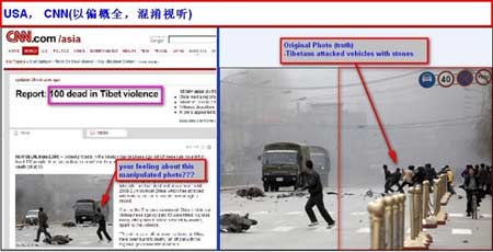 美國有線電視新聞網(CNN)和法新社在各自網站上使用了一張描述一輛車正向兩名平民駛來的圖片,雖然CNN網站的圖片說明寫的是“藏人向軍車投擲石塊”,但圖中卻看不見類似場景。事實上,當時軍車旁有約10名暴徒在向軍車投擲石塊,只是CNN和法新社未選取這種客觀描述暴徒惡行的照片。