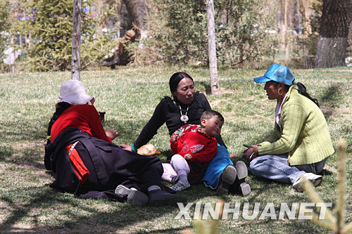 4月9日,龍王潭公園的草坪上,藏族群眾悠閑地享受春日的陽光。4月的拉薩,陰霾已逐漸散去,春天正快步走來。新華社記者 劉錚攝