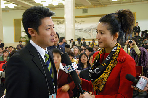 3月18日上午十一屆全國人大一次會議閉幕后,國務院總理溫家寶在人民大會堂三樓中央大廳與采訪十一屆全國人大一次會議的中外記者見面并回答記者提出的問題。圖為撒貝寧接受王小丫采訪。新華網 郭毅 攝