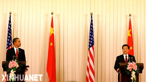 11月17日,中國國家主席胡錦濤和美國總統奧巴馬在北京人民大會堂共同會見中外記者。新華社記者李學仁攝