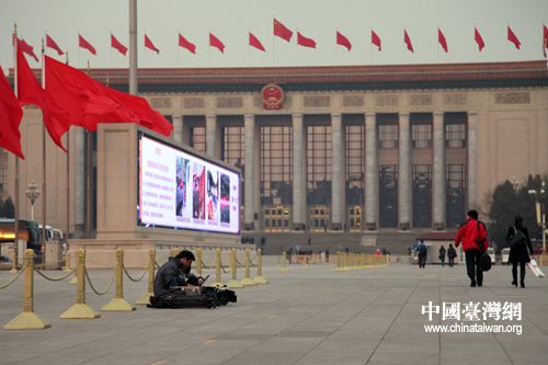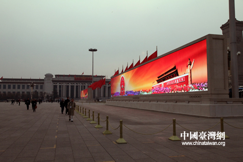 天安門廣場上兩塊大屏幕正在播放宣傳片。肖春陽、劉洋攝影報道
