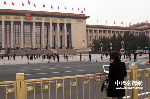 一位記者在大會堂前準備采訪提綱。肖春陽、劉洋攝影報道