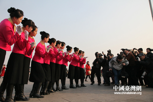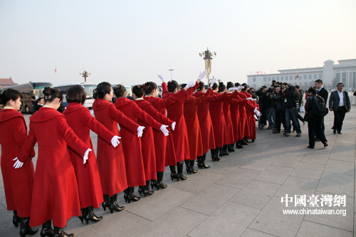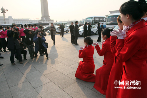 3月5日,十一屆人大四次會(huì)議在人民大會(huì)堂開幕。天安門廣場大會(huì)工作人員受到了記者的關(guān)注。各種造型的女服務(wù)員讓攝影記者不停地按下手中的快門。肖春陽、劉洋攝影報(bào)道