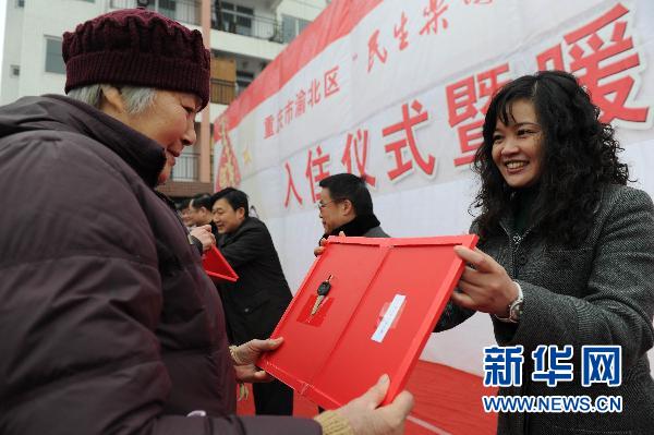 2011年1月17日,渝北區政府向市民發放新房鑰匙。當日,重慶市渝北區“民生工程”洛磧廉租房項目,向符合入住條件的600戶城鎮住房困難群眾發放了新房鑰匙。洛磧廉租房項目是重慶市渝北區政府投入5000萬元修建的困難群眾保障性住房,在未來5年時間內,渝北區還將建設300萬平米的保障性住房。新華社記者 陳誠 攝
