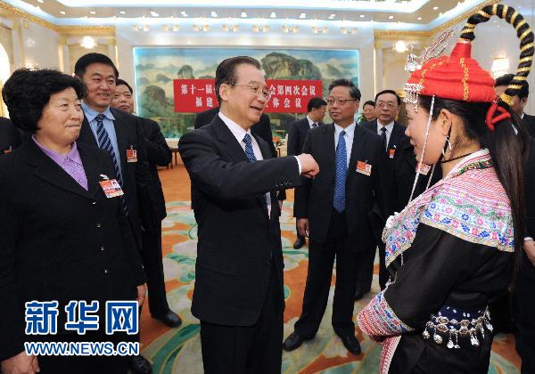 3月10日,中共中央政治局常委、國務院總理溫家寶參加十一屆全國人大四次會議福建代表團審議。這是溫家寶總理與來自福建的全國人大代表交談。新華社記者馬占成攝
