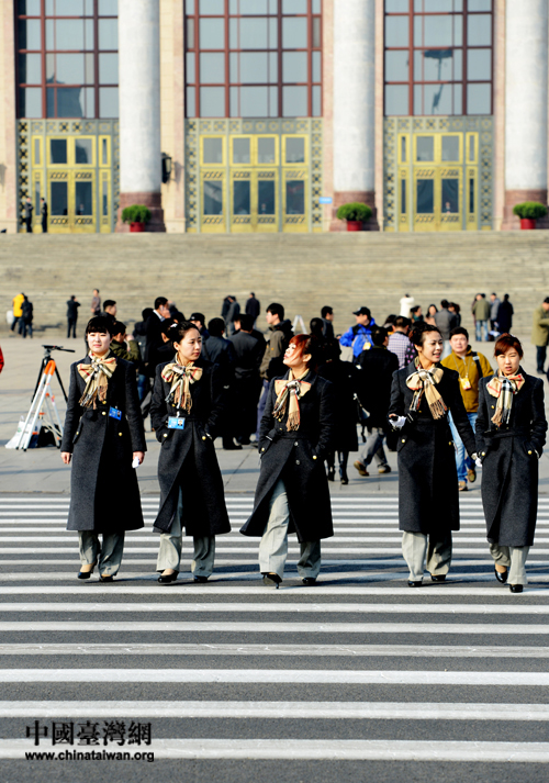 兩會期間,人民大會堂外,當記者們爭相追逐采訪拍攝代表、委員及 “美女”保障人員時,有一個默默無聞工作的群體------兩會清潔工。 (中國臺灣網 發)