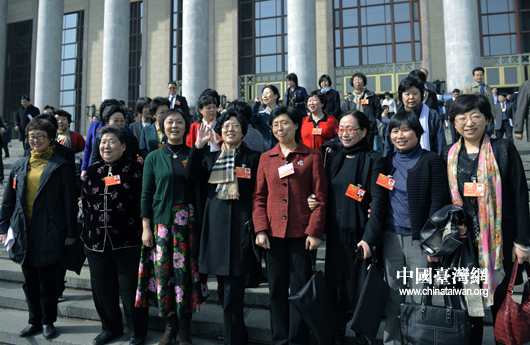 在天安門廣場上,女委員成為媒體記者追捧的焦點。(中國臺灣網 發)