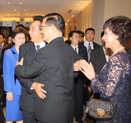 4日晚間,國民黨榮譽主席連戰在臺北國賓飯店宴請海協會會長陳云林一行。這是連戰與夫人在宴會廳入口迎接陳云林與夫人,兩位老朋友在臺灣熱情相擁。(田云鵬 攝)
