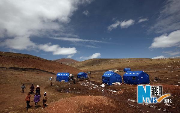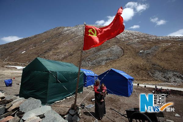 當(dāng)日,記者從青海玉樹縣結(jié)古鎮(zhèn)前往隆寶鎮(zhèn)采訪,一路上發(fā)現(xiàn),無論是在路邊的災(zāi)區(qū)群眾安置點(diǎn)還是深山草甸,都能看到飄揚(yáng)的五星紅旗和黨旗,看到解放軍和武警戰(zhàn)士們忙碌的綠色身影,看到政府發(fā)放的藍(lán)色帳篷。在無情的地震過后,在廢墟和藍(lán)天白云之間,紅色、綠色和藍(lán)色總能讓人心頭涌起一股暖流。新華社記者 費(fèi)茂華攝