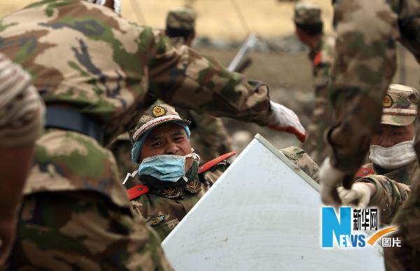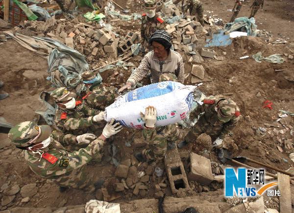 4月22日,武警戰(zhàn)士幫助牧民鐵尕把家中的財(cái)物從廢墟中清理出來。新華社記者 費(fèi)茂華攝