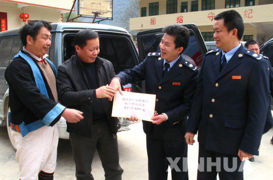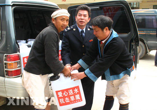 南丹縣國稅局領(lǐng)導給受災(zāi)瑤族同胞運水