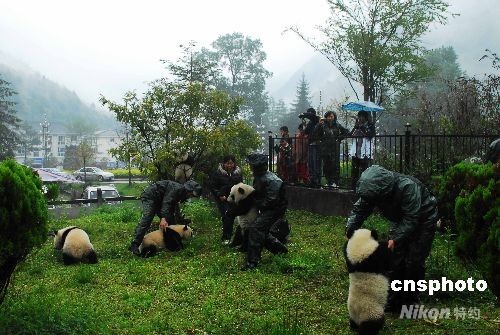 5月12日四川發生大地震后,臥龍保護區管理局的職工于第一時間將大熊貓轉移到安全地帶。在此次地震中,臥龍保護區管理局的房舍嚴重受損,其中32套大熊貓圈舍中有14套全部損毀,其余嚴重受損。圖為熊貓幼仔轉移至沙灣。 中新社發 臥龍人 攝
