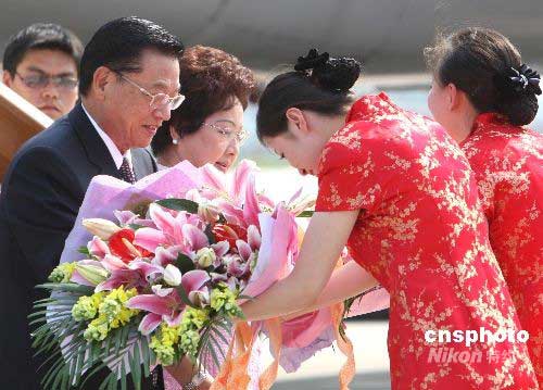 十一日下午三時十五分許,臺灣海峽交流基金會董事長江丙坤率海基會代表團抵達北京首都機場,禮儀小姐敬獻鮮花。中新社發 趙振清 攝