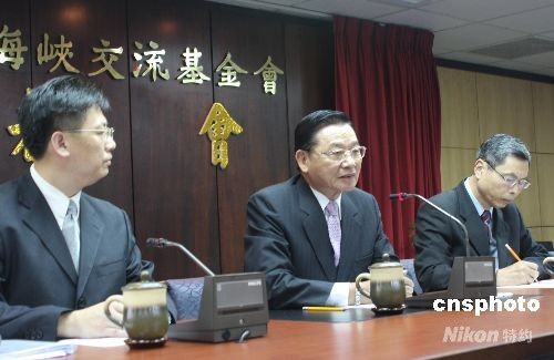 海協會與海基會即將恢復協商會談。六月十日中午,海峽交流基金會董事長江丙坤(中)、副董事長兼秘書長高孔廉(右一),在海基會十七樓第一會議室舉行赴北京商談前的特別記者會。六月十一日,江丙坤將率代表團赴北京。 江丙坤說:“明天,我們開始進行的是一項舉世矚目的活動,大家都在寫歷史。” 中新社發 耿軍 攝