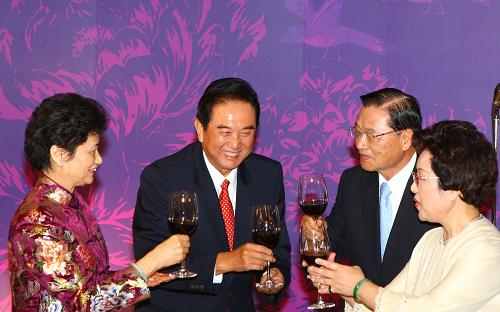 11月3日晚,海基會在臺北101大樓舉行宴會,歡迎陳云林會長率領的海協(xié)會協(xié)商代表團。這是陳云林夫婦和江丙坤夫婦共同舉杯。新華社記者 邢廣利 攝