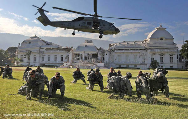 海地首都太子港,在被地震嚴重損毀的海地總統府前的草坪上,美國三二五空降步兵團的一些士兵正蹲在地上躲避直升飛機螺旋槳造成的渦流。