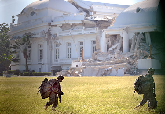 圖為美軍士兵正在徒步通過被地震嚴(yán)重?fù)p毀的海地總統(tǒng)府前的草坪。