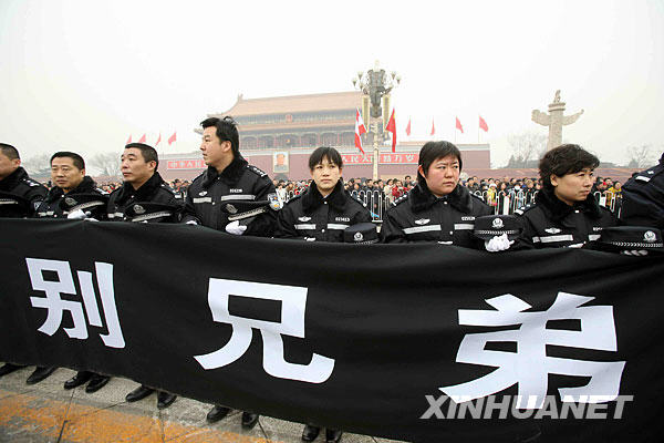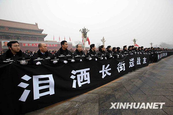 1月19日,專程接運(yùn)在海地地震災(zāi)害中遇難的八位中國維和警察靈柩的專機(jī)抵達(dá)北京。這是警察和群眾在長(zhǎng)安街上送別烈士靈柩。新華社記者 汪永基 攝