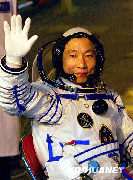 這是2003年10月15日,執(zhí)行中國首次載人航天飛行任務的航天員楊利偉出發(fā)登艙前揮手致意。新華社發(fā)
