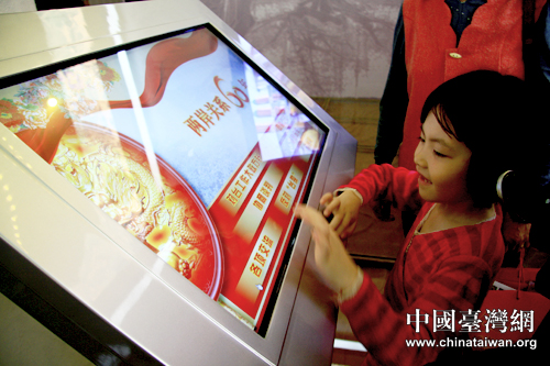 一位小姑娘在“兩岸關(guān)系發(fā)展展區(qū)”內(nèi)饒有興致地點擊介紹“兩岸關(guān)系60年”的觸摸屏(中國臺灣網(wǎng) 李徽 攝)