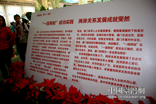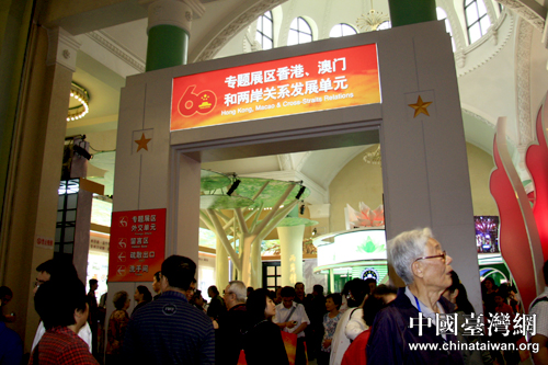 香港、澳門和兩岸關(guān)系發(fā)展專題展區(qū)前參觀者絡繹不絕(中國臺灣網(wǎng) 李徽 攝)