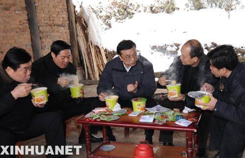 這是1月31日,李克強乘坐裝有防滑鏈的汽車在崎嶇覆冰的山路上行進3個小時,來到川北山區宣漢縣老君鄉紫云村。在察看災情、慰問群眾后,就和隨行陪同的領導一起邊用餐邊研究救災工作。飯后,又繼續驅車到下一個村子慰問。 新華社記者 李學仁 攝