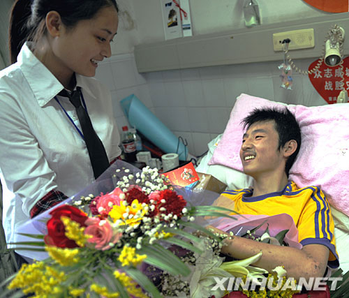 5月24日,來自四川省北川中學(xué)的廖波在重慶市南桐總醫(yī)院度過了他17歲的生日。5月13日,廖波被救援隊員從北川中學(xué)的廢墟中搶救出來,18日被轉(zhuǎn)移到重慶接受進(jìn)一步治療。面對突如其來的災(zāi)難,廖波始終堅強,這位因為地震失去左小腿的中學(xué)生在病床上始終面帶充滿希望的笑容。 新華社記者 周衡義攝
