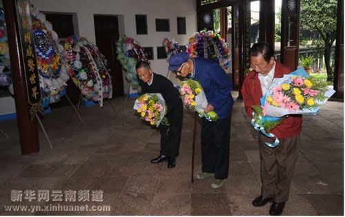抗戰老兵盧彩文(左,85歲),張慶斌(中,87歲)和邵應壬(右,88歲)在騰沖國殤墓園拜祭戰友 新華社記者 藺以光 攝