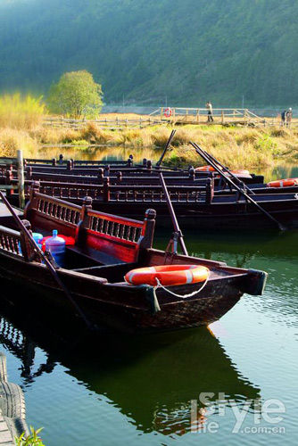 距縣城十來公里左右的北海濕地很特別,屬高原火山堰塞湖生態系統。我們所見到的成片成片的草塊都是漂浮在水面上。倘若你以為水很淺,草生長在水底泥上,那就錯了,實際上成片成片的水草的根須經過千萬年的生死串結而成,厚度大約在1米,被稱為“草排”,下面水深足有十幾米。當地人以前經常把分開的一小片草排當船來劃,捕魚蝦。如今為了環保及安全,濕地被保護起來,草排也是分片對游人開放,人工搭起的木板平臺橋一直延伸到濕地中,供游客穿行于草地上,欣賞周圍美景。不過乘坐游船深入漂浮的草排中,穿著雨靴體驗一把“踩”草排的經歷,卻是最讓人津津樂道的事兒。