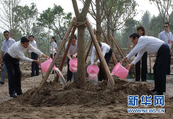 6月30日,陳云林(前右)、江丙坤(前左)在重慶照母山植物園為“合作共贏樹”澆水。當日,海峽兩岸關系協會會長陳云林與臺灣海峽交流基金會董事長江丙坤來到重慶照母山植物園,共同種下了“合作共贏樹”,慶祝雙方成功簽署《海峽兩岸經濟合作框架協議》《海峽兩岸知識產權保護合作協議》。新華社記者 陳誠攝