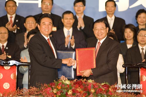 海協(xié)會(huì)會(huì)長陳云林與海基會(huì)董事長江丙坤簽署海運(yùn)、空運(yùn)、通郵和食品安全等四項(xiàng)協(xié)議。中國臺(tái)灣網(wǎng) 田云鵬攝
