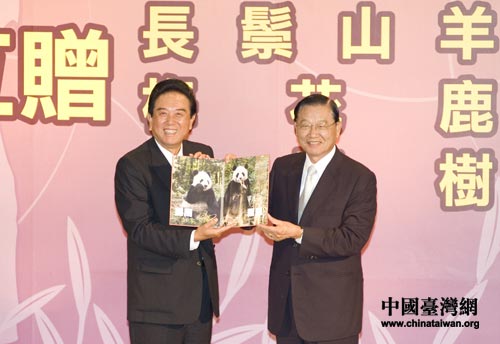 陳云林江丙坤舉行互贈(zèng)儀式,陳云林向江丙坤贈(zèng)送“團(tuán)團(tuán)”、“圓圓”圖譜。中國臺(tái)灣網(wǎng) 田云鵬攝