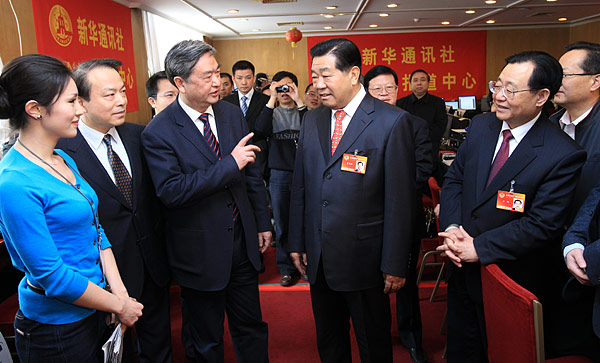 3月13日,中共中央政治局常委、全國(guó)政協(xié)主席賈慶林親切看望新華社兩會(huì)前方報(bào)道人員。新華社記者 龐興雷 攝