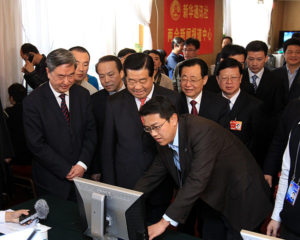 上午全國(guó)政協(xié)十一屆三次會(huì)議閉幕后,賈慶林來(lái)到位于人民大會(huì)堂一層的新華社兩會(huì)新聞報(bào)道中心,同正在這里緊張工作的采編、技術(shù)人員一一握手,向大家表示親切的問(wèn)候。
