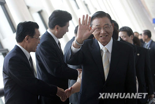 4月29日,江丙坤向送行人們揮手致意。新華社記者邢廣利 攝